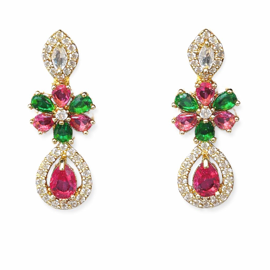Elegant drop earrings featuring colorful floral stones with a sparkling tear drop finish.